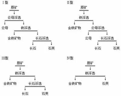 (1)先浮云母再浮含鐵礦物然后浮長(zhǎng)石。先用硫酸調(diào)整礦漿PH到3~4,用胺類(lèi)捕收劑浮選云母,然后用鹽酸調(diào)整礦漿PH到4~5,以磺化石油作捕收劑浮選含鐵礦物,然后用氟氫酸調(diào)整PH到2~3,用胺作捕收劑,浮選長(zhǎng)石。石英以尾礦形式產(chǎn)出(圖Ⅰ型)。