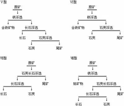 (8)浮鐵礦物后再進(jìn)行長(zhǎng)石和石英混合浮選。它適用于含鐵高的石英砂(圖Ⅷ型)。